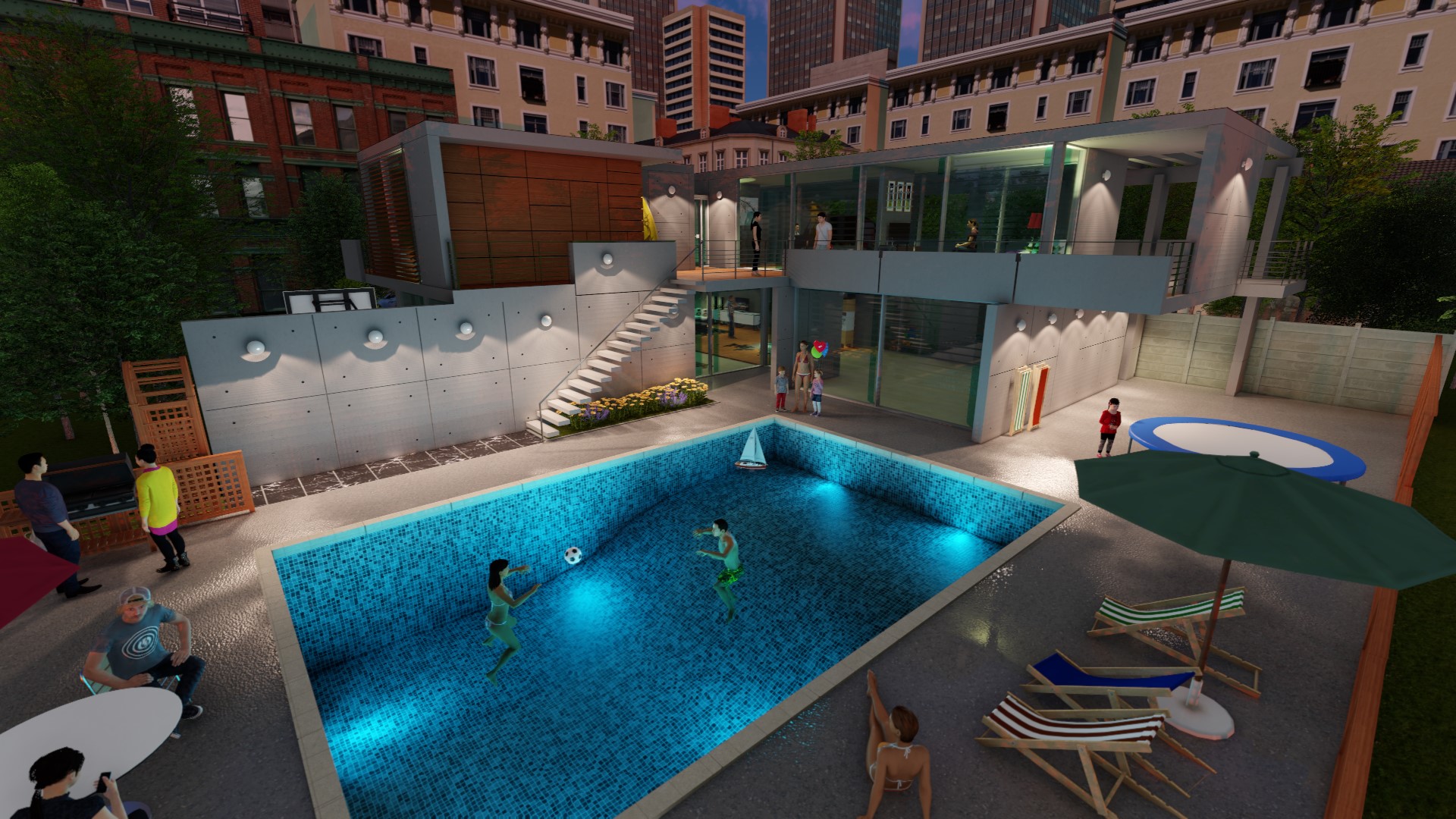 モデリングされたCADデータに、洗練されたコンピュータグラフィックスを施すことで、ガラスや水などの透明な素材からコンクリート、金属や木材などの多彩な表現を美しく実現します。更に条件を指定することで光の変化や時間の経過を表現することもできます。あなたの考えた空間にリアリズムを与えて本当に存在するかのような振る舞いを見せます。